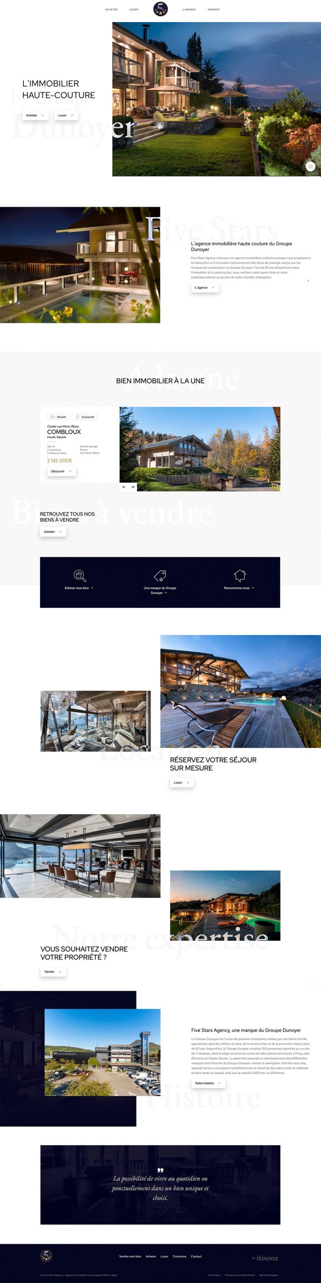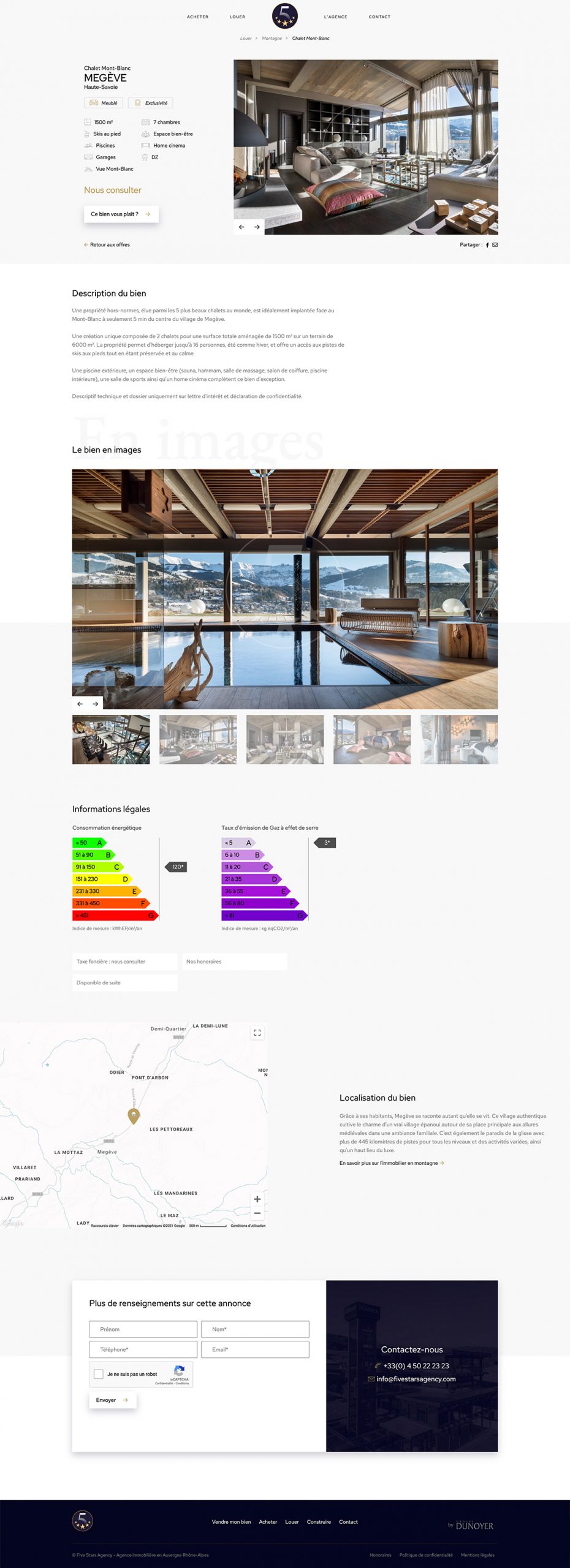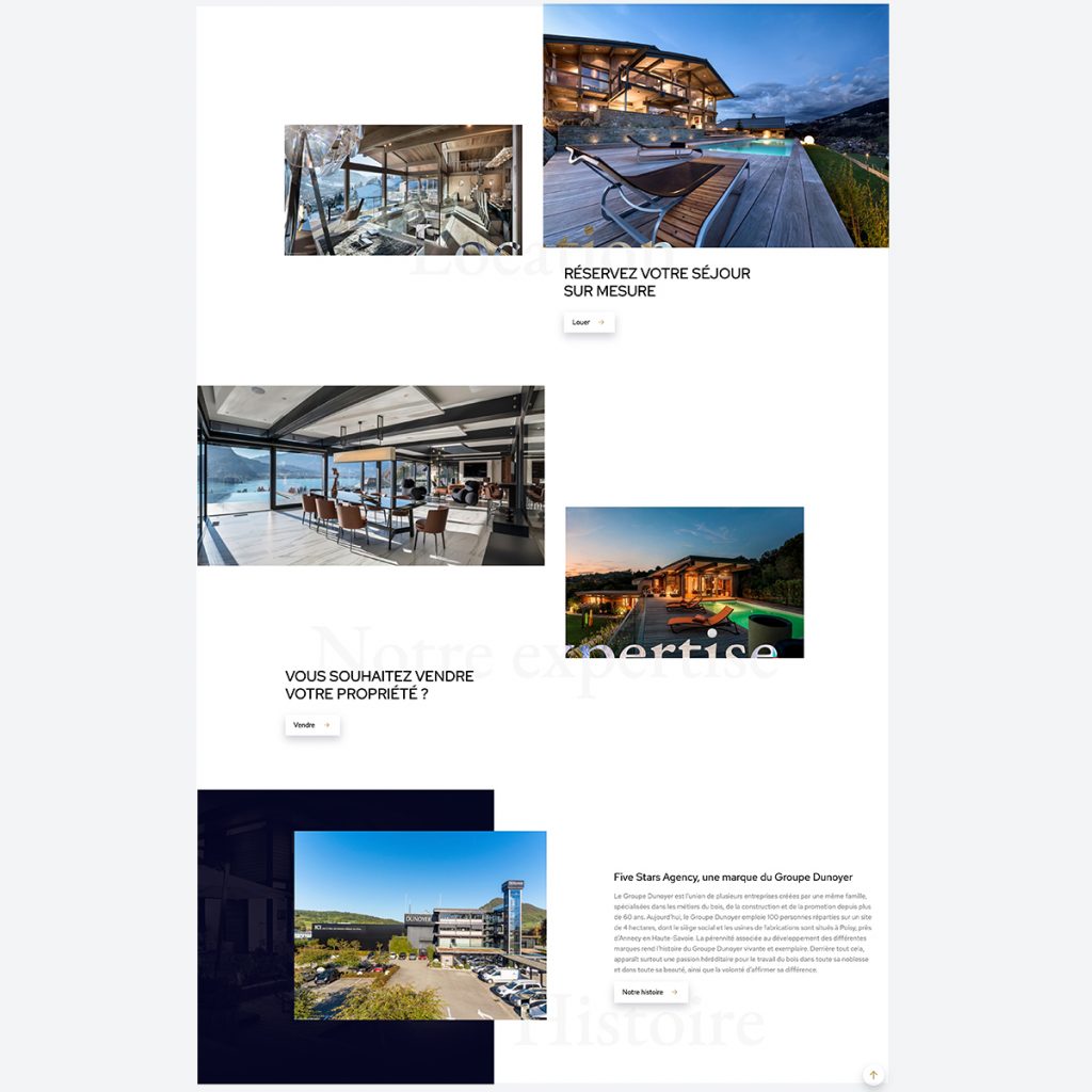 Five Stars Agency is a luxury brand of Groupe Dunoyer which sells and rents exceptional chalets. They asked us for a platform to present their goods and be contacted by interested people.